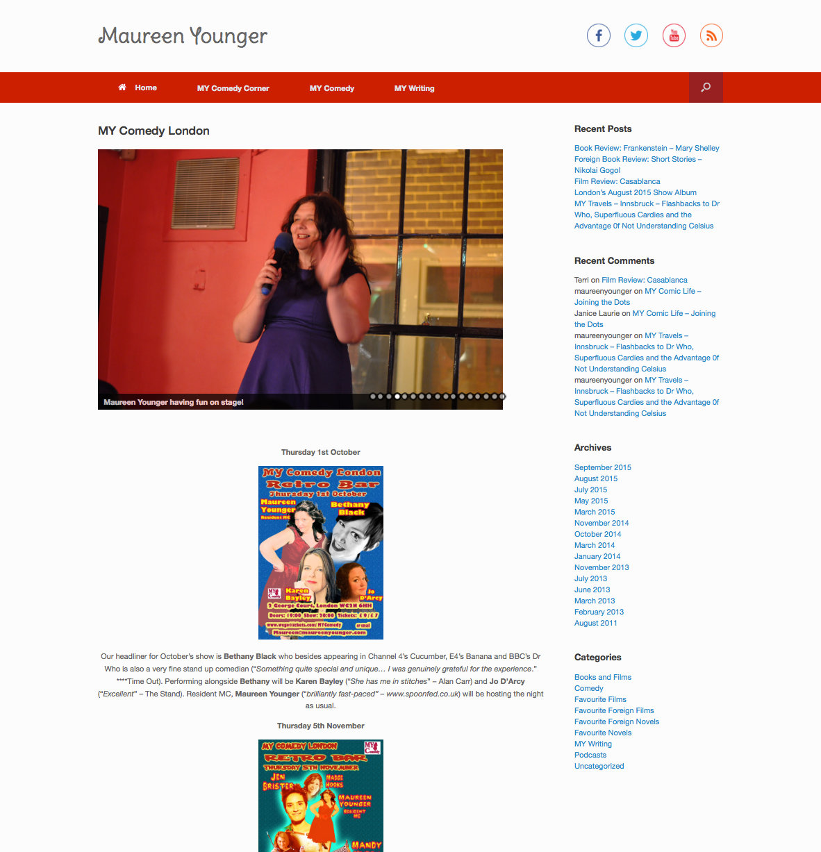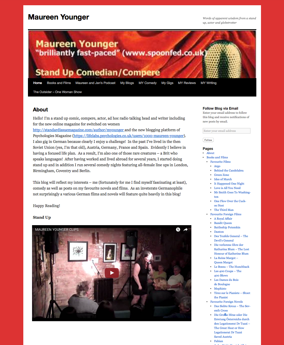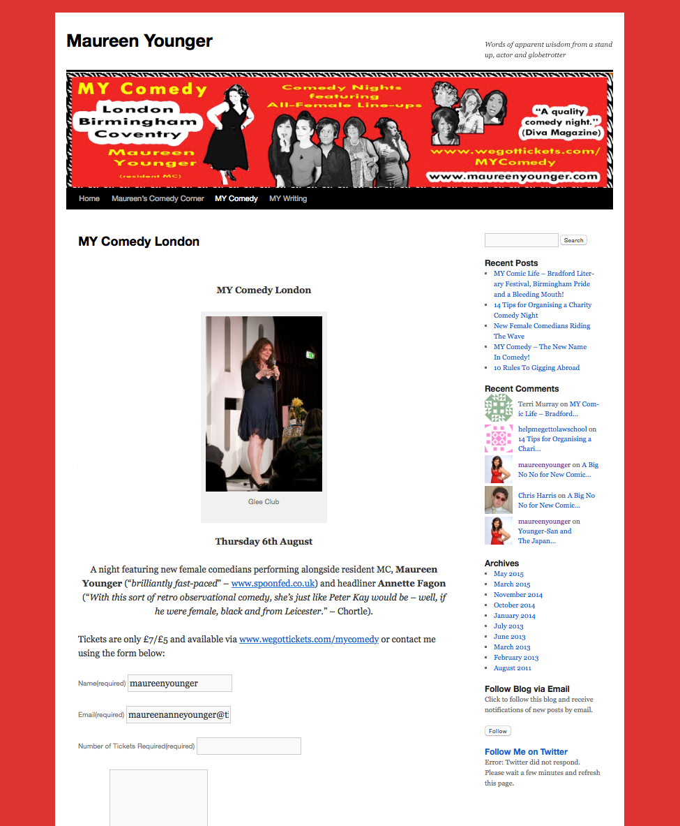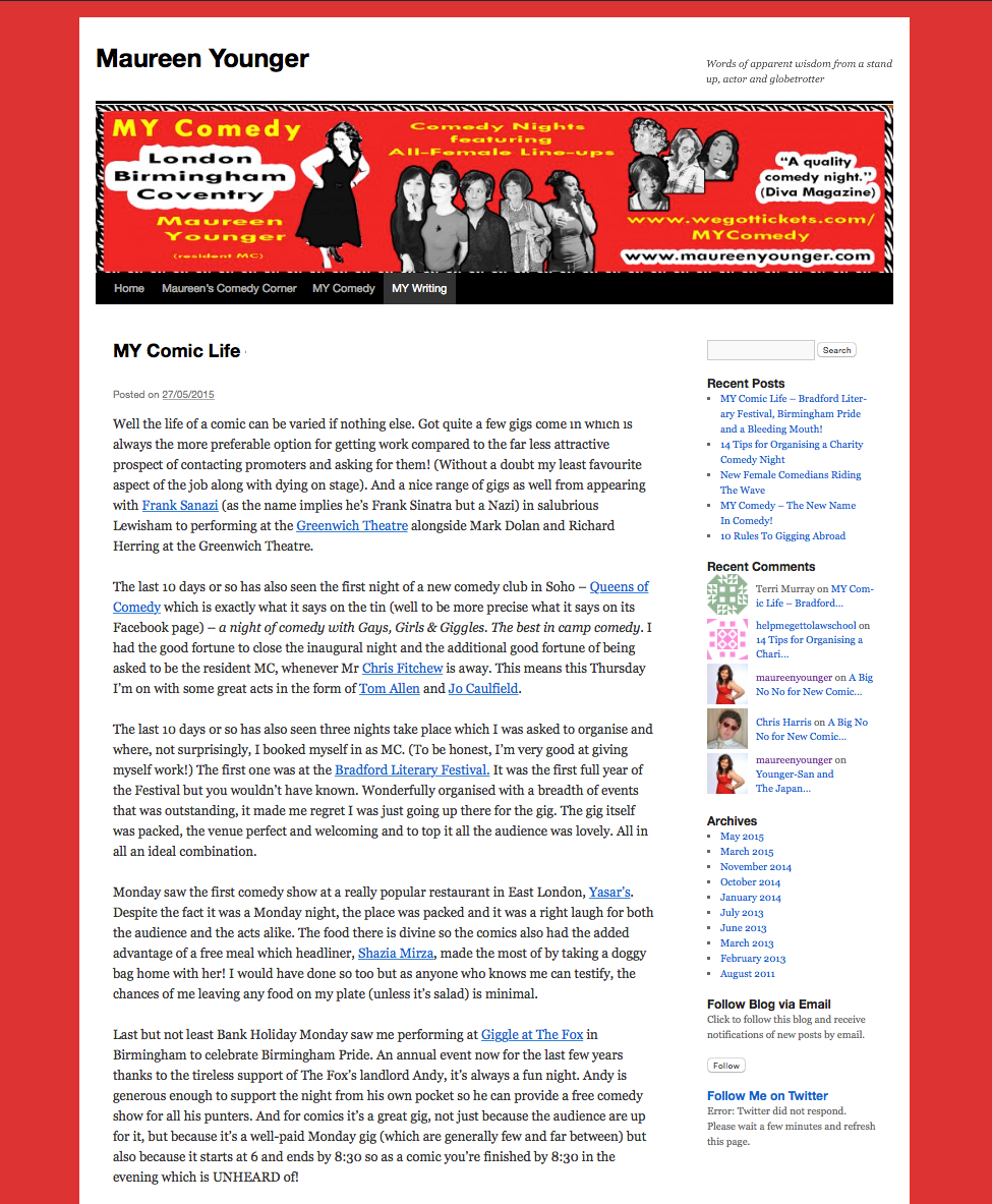 Maureen Younger is a talented writer, actress and stand up comedian who I’ve had the pleasure of knowing for a couple of years now, having first met through attending the Laughing Cows comedy night she coordinated and compered. During 2015 Maureen has spun out her own brand of comedy: MY Comedy – which is unusual in featuring all female comedy line ups. Maureen’s comedy nights can be found in London and the Midlands and attract a strong following by the LGBT community. Beyond building out her comedy nights, Maureen regularly gigs on the black and lesbian comedy circuit and is increasing her writing contributions for female oriented publications.