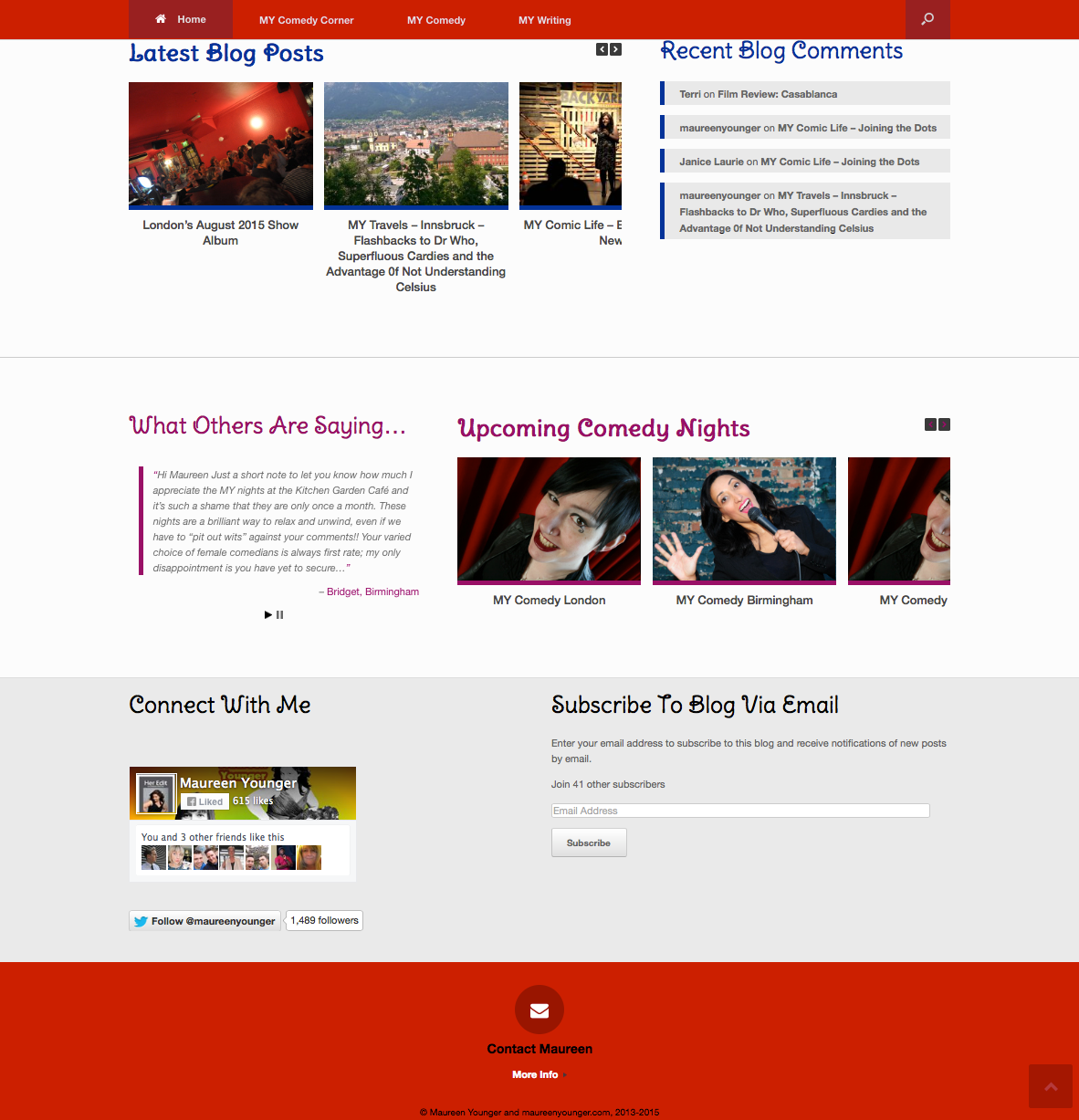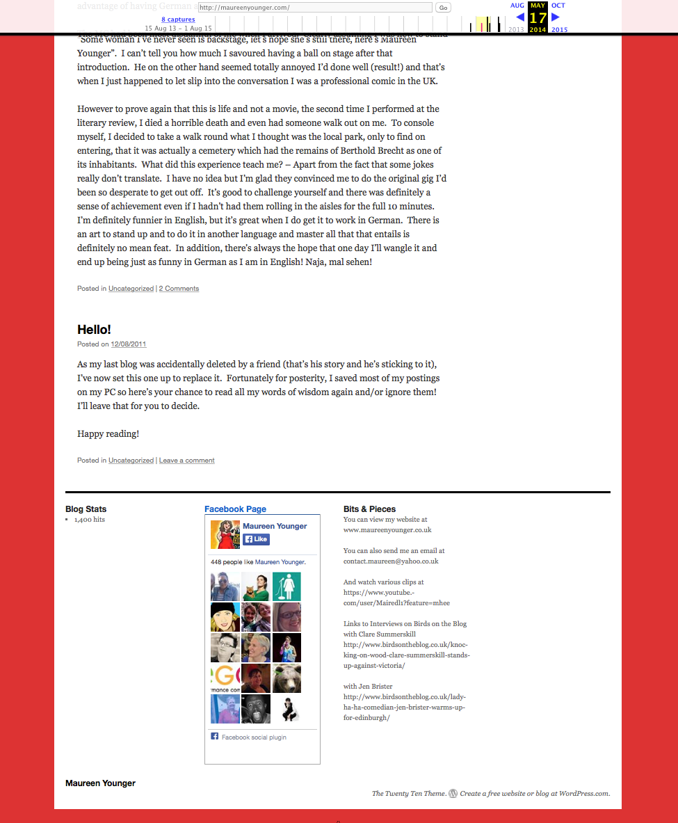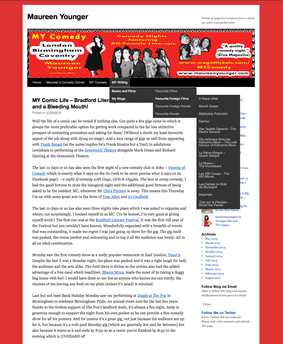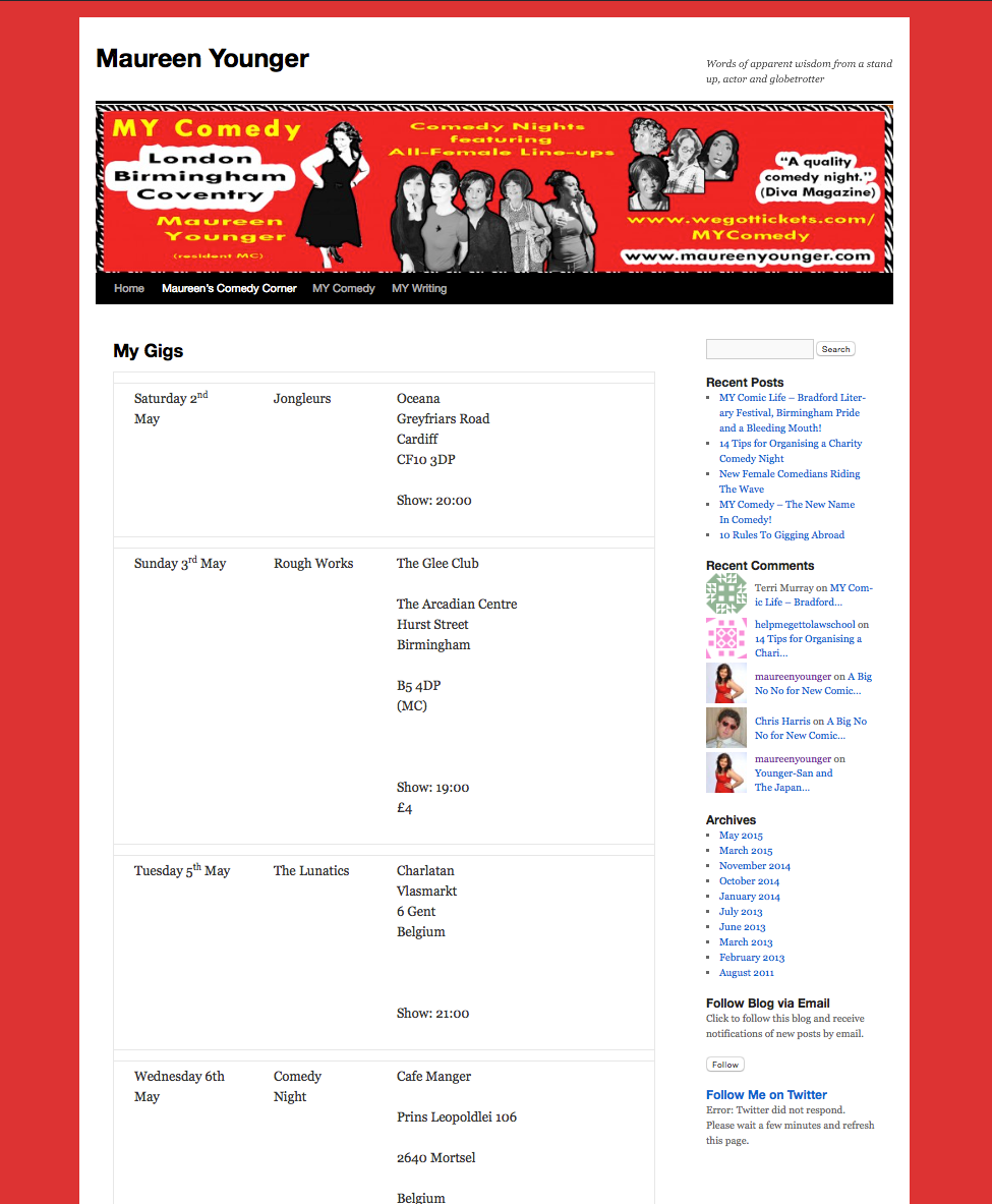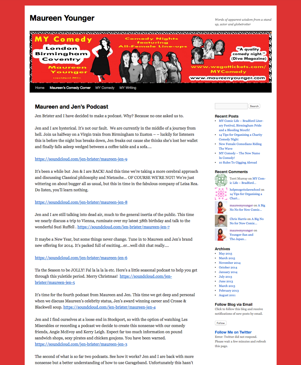 Maureen is no slow coach when it comes to technology and social media, but when I first met Maureen her website had reached the limitations of what could be achieved via free web hosting and as a result it feel left behind in the 2000’s. Creating a brand new site was beyond Maureen’s skillet, and with limited budget she was forced to make the most of what she had. Through talking to Maureen I spotted an opportunity to partner my technical, user experience and social engagement skills with her vibrant and charismatic personal brand and reflect this much more prominently via her virtual online presence. Throughout 2015 I have been volunteering with Maureen to turn concepts, into reality. Over the summer of 2015 I have migrated her old website to new hosting, and redesigned it from scratch, making the most of tried and tested, reusable components wherever possible to minimise development overhead and testing. Future major updates are planned over the coming months.